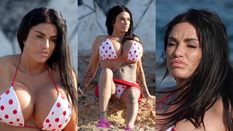 Katie Price, była modelka, skandalistka i miłośniczka operacji plastycznych, rozkoszowała się słońcem Ibizy w skąpym bikini. Celebrytka zwróciła na siebie uwagę dwuczęściowym kostiumem w biało-czerwone groszki, który ledwo okrywał jej klatkę piersiową. Dla wygody założyła jaskraworóżowe Crocsy na obcasie.