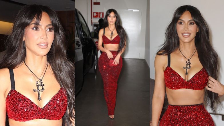 Choć w przypadku rubinowej kreacji Kim z powodzeniem mogłaby zrezygnować z dodatków, celebrytka i tak postanowiła nieco podrasować swój look. Do cekinowego kompletu Kardashianka dobrała niewielką torebkę i ulubione buty z przezroczystego plastiku, na szyi zawiesiła zaś dwa okazałe krzyże w gotyckim stylu. Celebrytka nie zapomniała rzecz jasna o dopracowanym w każdym calu makijażu, zadbała również o dopasowany do koloru stylizacji manikiur. Uwagę zwracała także naturalna fryzura Kim z niepozorną grzywką.