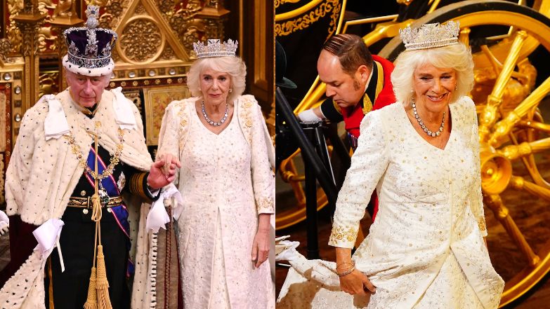 Uwagę bez wątpienia zwracał również strój Camilli. Królowa małżonka w brytyjskim parlamencie pojawiła się bowiem w tej samej kreacji, którą miała na sobie podczas majowej koronacji. Długa, bogato zdobiona suknia w kolorze kości słoniowej została zaprojektowana przez Bruce'a Oldfielda. Na kreacji wyhaftowano imiona dzieci i wnuków królowej małżonki, znalazły się też na niej podobizny ukochanych pupili Camilli. Odświętną stylizację żony brytyjskiego monarchy dopełnił okazały diamentowy diadem.