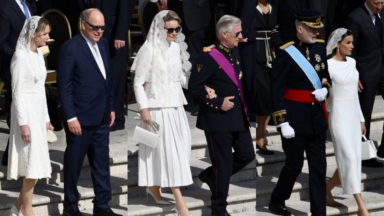 Charlene postawiła na rozkloszowaną sukienkę za kolano i jasne buty na obcasie. Stylizację uzupełniła kopertówką. Królowa Hiszpanii założyła długą, nieco bardziej przylegającą kreację z rozcięciem z tyłu. Za to żona króla Belgii wybrała z tej okazji komplet złożony z plisowanej spódnicy i marynarki. Wszystkie członkinie rodzin królewskich zasłoniły głowy koronkowymi mantylami. Z przywileju noszenia bieli skorzystała także wielka księżna Maria Teresa, która wybrała długą sukienkę z paskiem w talii i dekoltem. Żona księcia Luksemburga zrezygnowała jednak z zakrycia głowy.