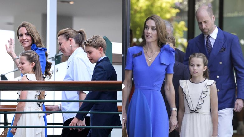 Podobnie jak w sobotę sportowe zmagania oglądać będzie księżna Kate, która postawiła na długą niebieską kreację z kokardą na ramieniu. Towarzyszy jej mąż w dwukolorowym zestawie złożonym z granatowej marynarki i jasnych spodni. Książęca para zabrała ze sobą dwie pociechy - Charlotte i George. Nieobecny jest Louis, znany z zabawnych reakcji podczas oficjalnych wyjść.