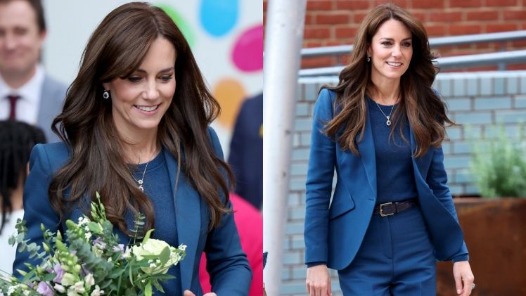 Tego dnia księżna zaprezentowała się w dopasowanej, kobaltowej marynarce od Alexandra McQueena, którą zaprojektowała Sarah Burton. Wspomniany projekt kosztuje ok. 10 354 zł. Pod marynarkę Kate założyła granatową bluzkę, do której dobrała spodnie w podobnym odcieniu oraz ciemnobrązowy skórzany pasek.