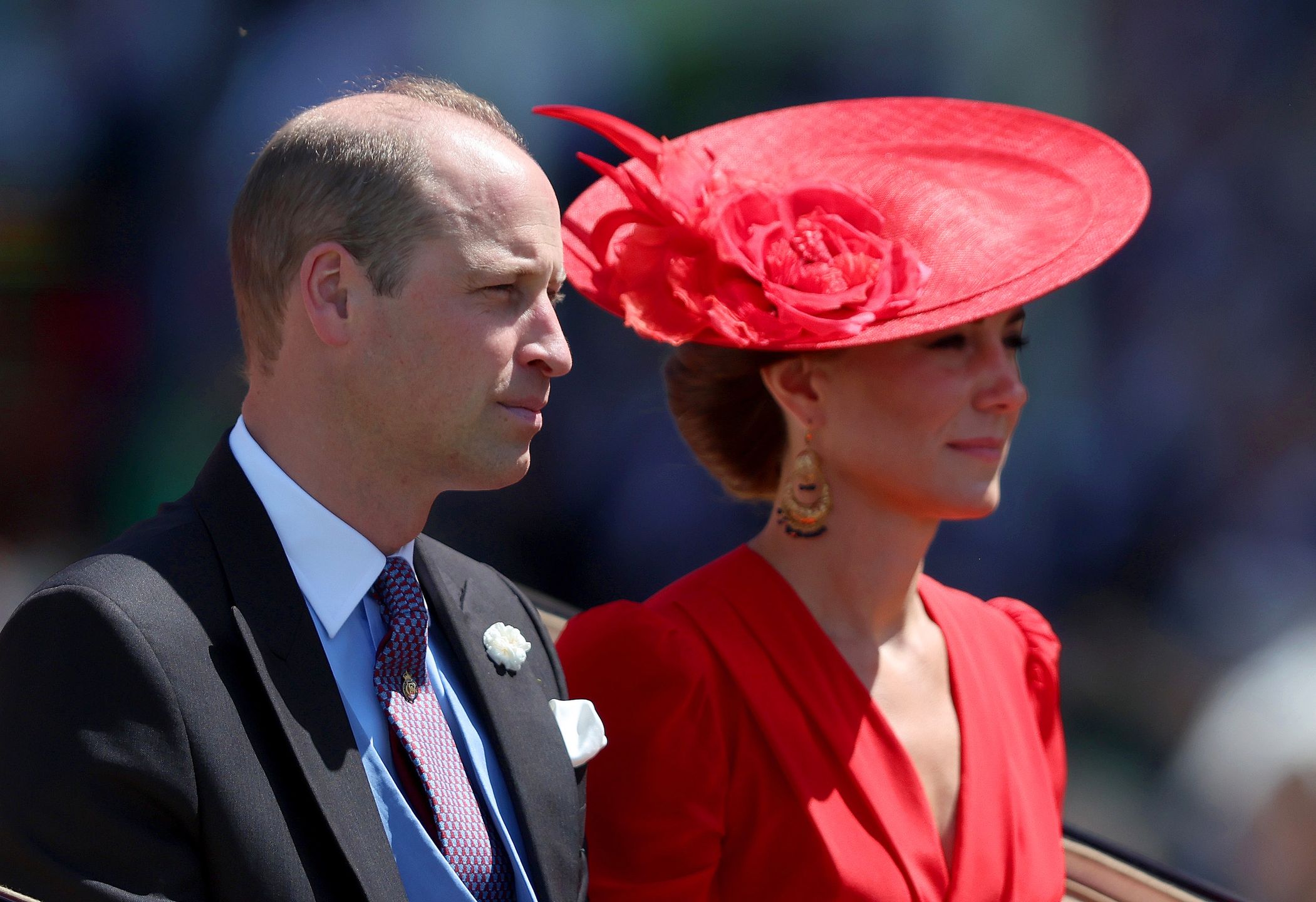 Równie spektakularna okazała się stylizacja księżnej Kate. Żona Williama wystąpiła w czerwonej sukience midi od Alexandra McQueena, która została zaprojektowana specjalnie dla niej. Elegancję podkreśliła gustownym kapeluszem od Philipa Treacy'ego. W kwestii biżuterii zdecydowała się na złote, mosiężne kolczyki od Sezane, które kosztują 385 zł.