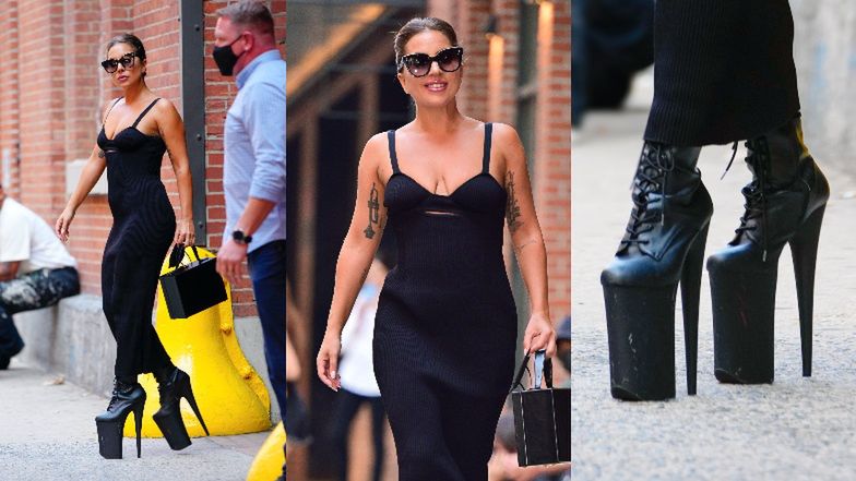 Lady Gaga w eleganckiej sukience polskiej projektantki paraduje po ulicy na NIEBOTYCZNIE wysokich platformach (ZDJĘCIA)