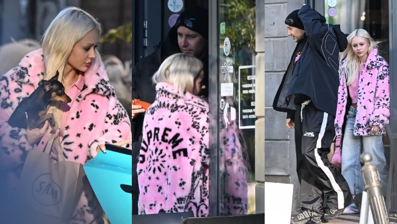 Tego dnia influencerka postawiła na luźną stylówkę, składającą się ze spodni jeansowych oraz futrzanej kurtki. W ręku dzierżyła torebkę oraz psa.