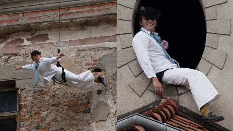Aktor postanowił zademonstrować, że żadne wyzwanie nie jest mu straszne. Mieszkańcy i zwiedzający Domanice byli świadkami jego podniebnych akrobacji. Okazały się one elementem przedstawienia, które zostanie wystawione w najbliższy weekend.