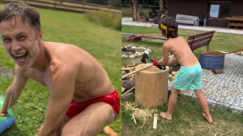 We wtorek pokazał na Instastories, jak spędza z latoroślami czas na dworze. Na opublikowanych przez niego zdjęciach i nagraniach widzimy, że zorganizował im survival. Starszy z synów aktora nawet rąbał samodzielnie siekierą drewno. Świetnie bawił się również sam tata. Na jednym z filmów internauci mogli oglądać bowiem, jak przyodziany w czerwone kąpielówki Zakościelny dokazuje beztrosko na ślizgawce wodnej.