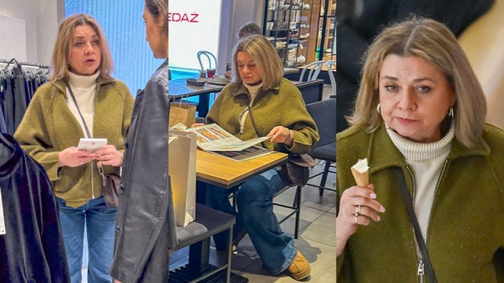 Sama nie zapomniała o modnej stylizacji: do dzianinowej krótkiej kurtki w kolorze zgniłej zieleni dobrała golf w kolorze écru i do tego modne szerokie dżinsy. Całość uzupełniona była masywnymi traperami i skórzaną torebką.