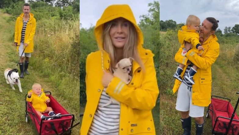 Wszystko wskazuje na to, że powoli Gonia przyzwyczaja się do życia w drodze. W środę po południu dała się nawet namówić na spacer w deszczu. Jak na perfekcyjną panią domu przystało, zapobiegawcza Rozenek spakowała dla wszystkich stylowe sztormiaki.