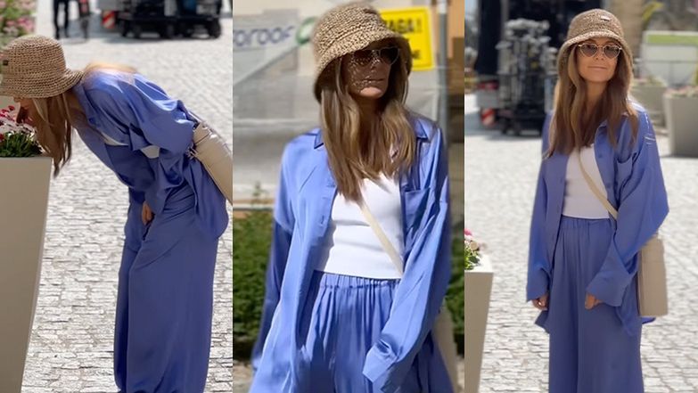 Podczas pobytu z ekipą "Dzień Dobry TVN" na Zamku Książ, Małgorzata Rozenek-Majdan wybrała się na zwiedzanie okolicy w komplecie pochodzącym z najnowszej kolekcji jej marki. Satynowa "piżamka" Mrs. Drama w bieliźnianym odcieniu niebieskiego kosztuje niemało, bo 799 zł. Luźnej koszuli i szerokim spodniom towarzyszyły równie oryginalne dodatki: pleciony kapelusik bucket hat, przewieszona przez ramię torebka na bidon z wodą oraz okulary przeciwsłoneczne w kształcie serc.