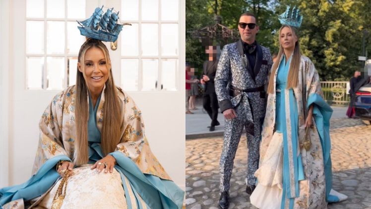 Celebrytka wzięła sobie temat przewodni do serca i zadała szyku w wielowarstwowej, bufiastej, kremowej sukni z błękitnymi akcentami oraz nakryciu przypominającym kimono. Wzorzysta kreacja z trenem została uzupełniona przez gwiazdę TVN złotymi sandałkami na obcasach, licznymi, masywnymi bransoletami, a także... figurą niebieskiego statku, który posłużył za nakrycie głowy.