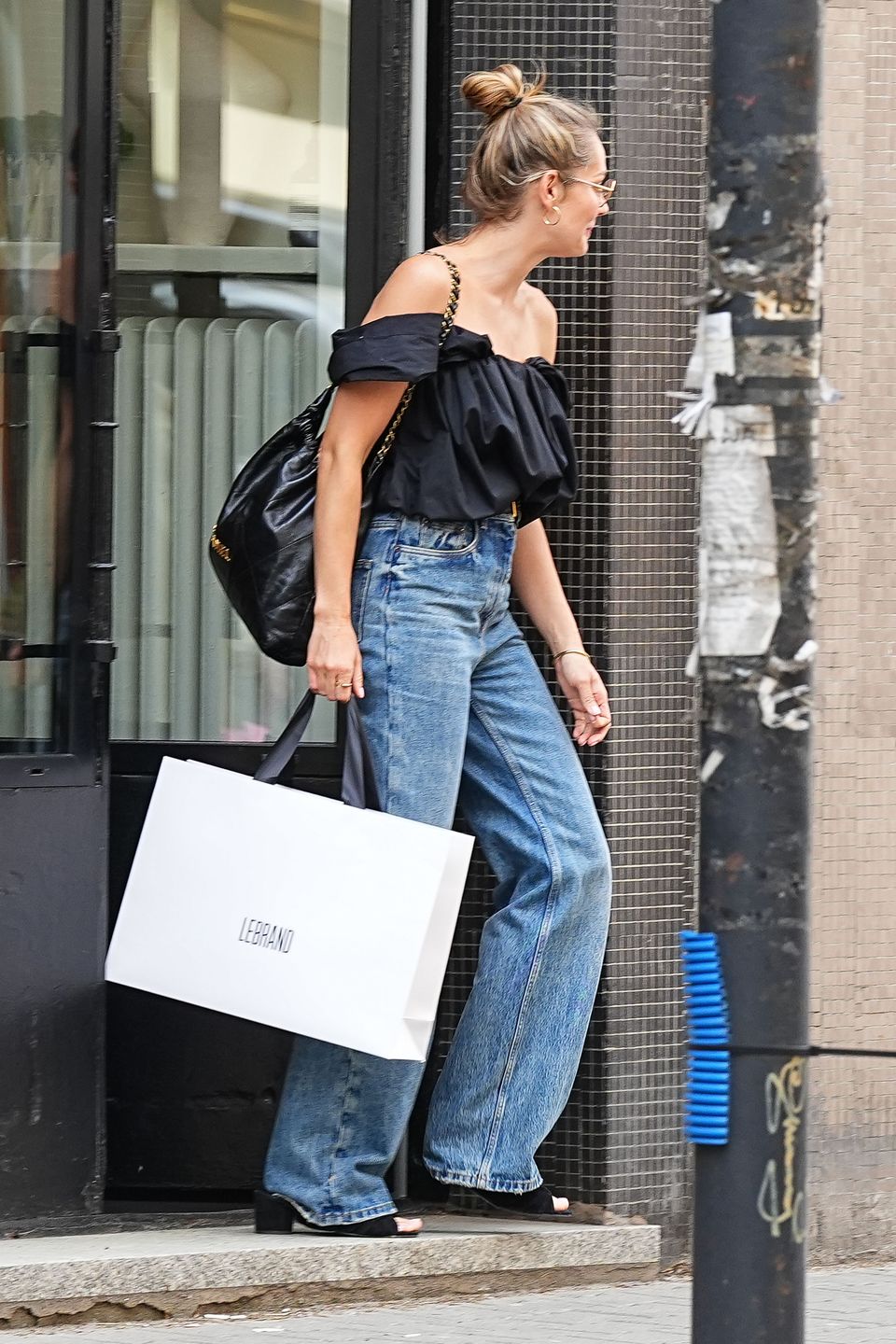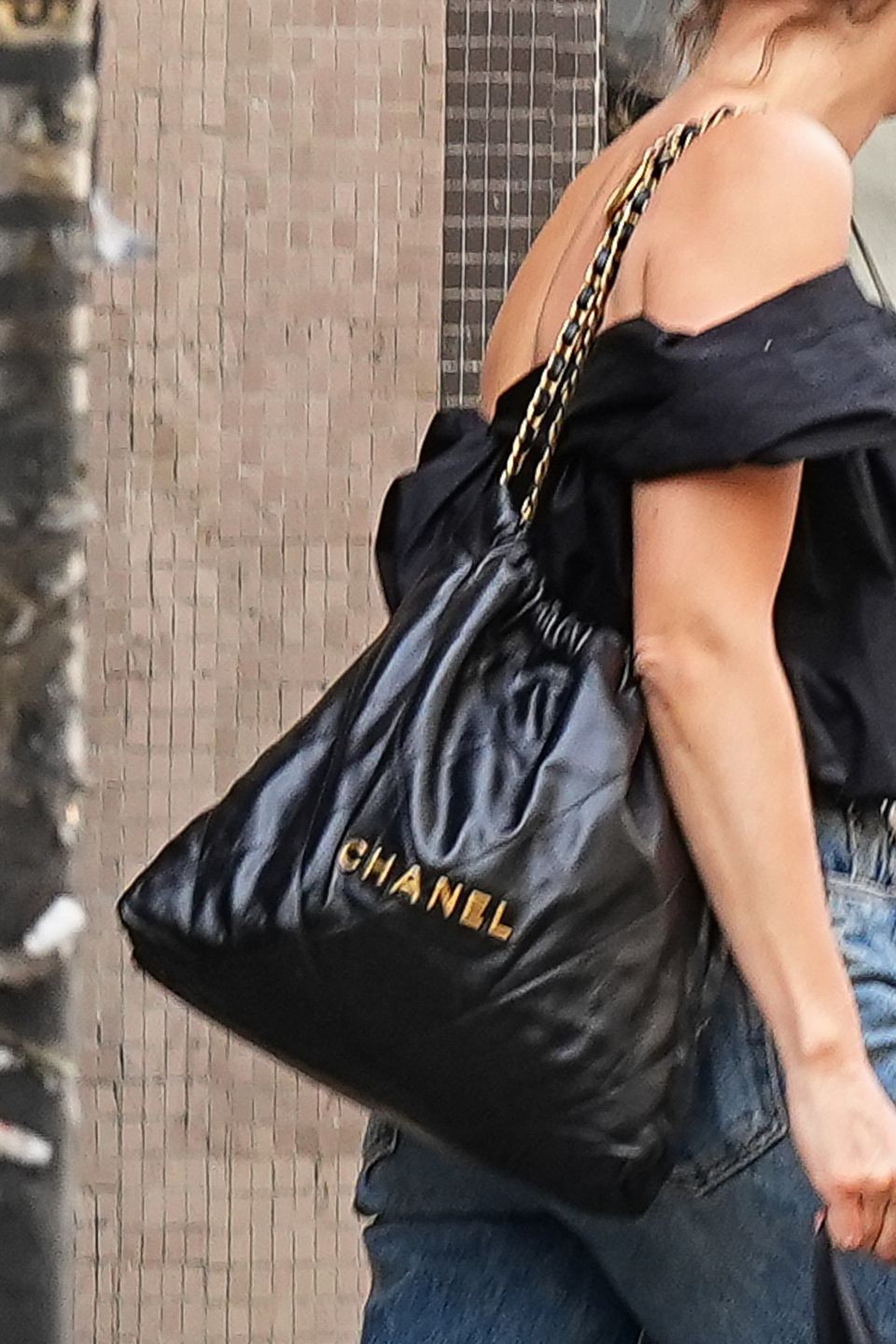 Na ramieniu gwiazdy zawieszona była czarna torba Chanel. Jest to model z kolekcji vintage zrobiony ze skóry, ze złotym łańcuchem. Ten projekt w kształcie worka kosztuje ponad 25 tysięcy złotych.