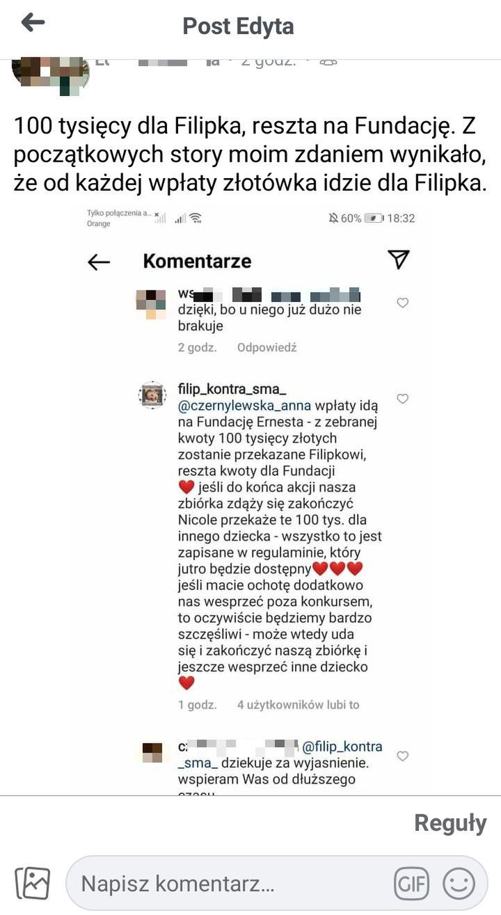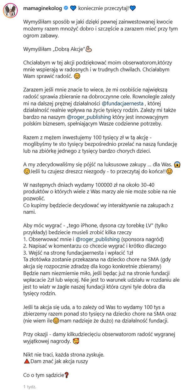 Po pierwsze: Nicole zapowiedziała konkurs tydzień temu, jednak dopiero we wtorek poprowadziła live na Instagramie, w którym uściśliła jego zasady. Przez kilka dni namawiała więc fanów do wpłacania pieniędzy, by dopiero później stwierdzić, że wcześniejsze wpłaty są falstartem i nie zapewnią udziału w konkursie. Wpłaciłeś pieniądze na Filipka z SMA? Nie, wpłaciłeś pieniądze na Fundację Medycyny Prenatalnej im. Ernesta Wójcickiego.
