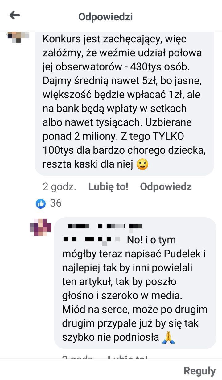 "Jeśli chcecie wziąć udział w konkursie każdego dnia, to każdego dnia musicie wpłacić minimum złotówkę" - słyszymy na nagraniu. Teraz najważniejsze: każda złotówka wpłacana jest do puli dla Filipka (do puli, nie na konto na zrzutka.pl, o czym za chwilę), ale gdy uzbiera się 100 tysięcy złotych, to nadwyżka zostanie przeznaczona na Fundację Mamy NIE-Ginekolog. Nicole po prostu zbiera pieniądze, z których "pierwsze" 100 tysięcy obiecuje przekazać na zbiórkę dla chorego dziecka, a resztę przeznaczy na "cele statutowe" Fundacji. "Bardzo was prosimy, żebyście wpłacali więcej, to jest nasz foundraiser" - pada z ust Sochacki-Wójcickiej.