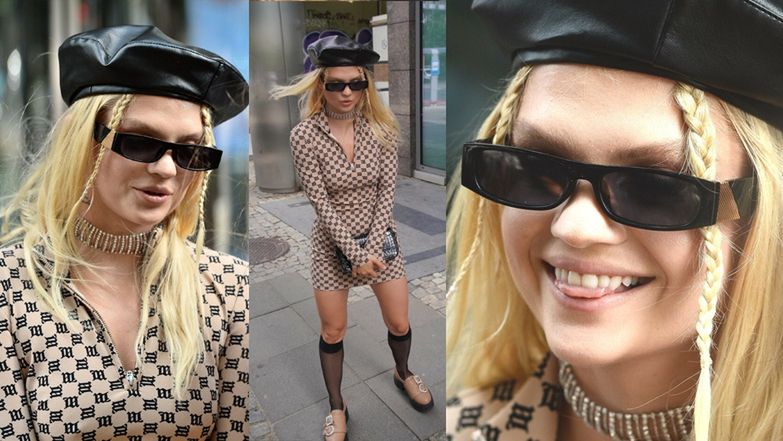 Do studia śniadaniówki "Maggie" przyszła ubrana w sukienkę za ponad tysiąc złotych. Do tego dobrała kolię, ciemne okulary i skórzany beret. Całości dopełniały prześwitujące podkolanówki, masywne półbuty i lakierowana torebka.
