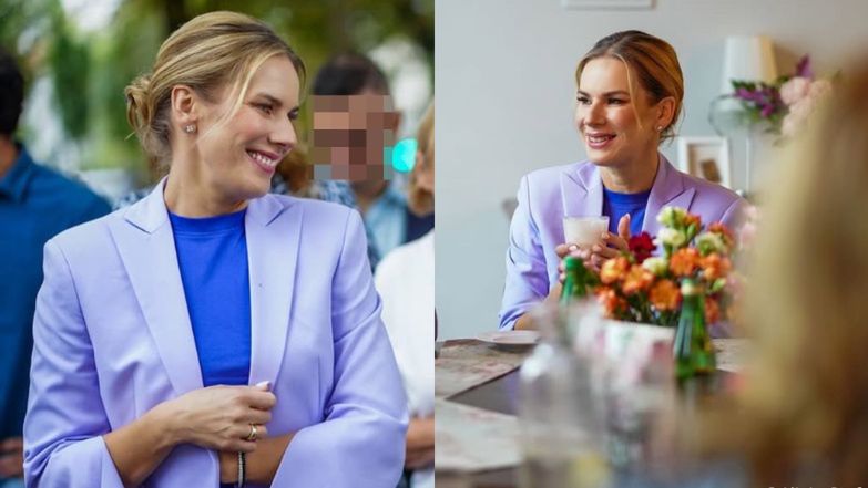 Najkrótsza ocena kolorystyczno-fasonowa? Oczy bolą. Lawendowy odcień marynarki, choć letni i świeży, w zestawieniu z intensywnie szafirową bluzką to połączenie, które w praktyce niemal zawsze zawodzi. To nie jest eksperyment ryzykowny, to zestaw skazany na konflikt wizualny. Niestety, górna część stylizacji przyciąga uwagę w sposób niekontrolowany i zaburza komunikację wizerunkową. Zamiast podkreślać autorytet i lekkość, tworzy efekt wizualnego napięcia - oceniła stylistka i ekspertka ds. wizerunku.