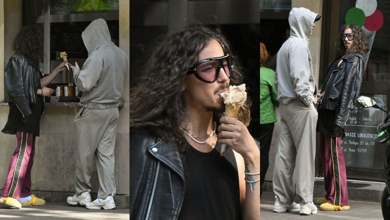 Michał Szpak pałaszuje lody na mieście w towarzystwie tajemniczego znajomego. Do lodziarni wyszedł w bamboszach. Stylowo?
