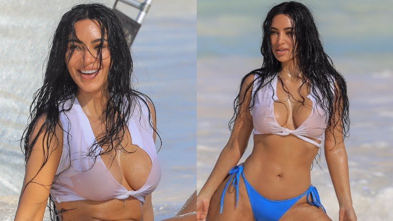 Na zdjęciach wykonanych przez paparazzich widzimy Kim Kardashian wyginającą się na plaży i w oceanie. Celerbrytka miała na sobie jedynie dół od bikini oraz kusą, przemoczoną białą koszulkę.