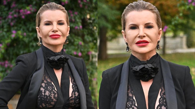 Obcisłe spodnie i wysokie obcasy podkreśliły zgrabną figurę 49-latki. Ciekawym elementem była też czarna różna na jej szyi. Racewicz uzupełniła swój wilanowski "look", zaczesując włosy do tyłu i nakładając na usta krwisto czerwoną szminkę. W takim wydaniu wyglądała jak prawdziwa femme fatale.