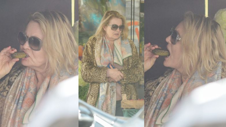 Szapołowska, z wrodzoną gracją, w lamparcim futerku i okularach przeciwsłonecznych, spałaszowała kiszony przysmak.
