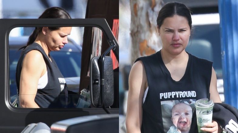 NABURMUSZONA Adriana Lima bez makijażu czmycha do samochodu po wizycie na siłowni. Uwagę zwraca urocza koszulka (ZDJĘCIA)