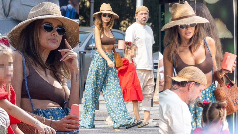 Tego dnia 41-latka miała na sobie letnią stylizację, na którą składały się niebieskie kwieciste szerokie spodnie, obcisły brązowy top, kapelusz oraz klapki. Jej mąż z kolei postawił na beże, a córka miała na sobie czerwoną sukienkę.