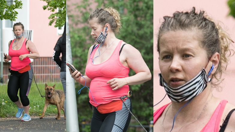 Naturalna Anna Powierza z maseczką pod brodą biega z psem (ZDJĘCIA)