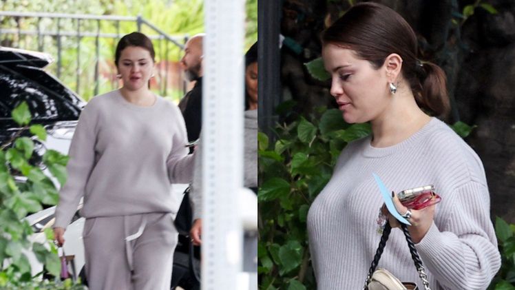Tego dnia aktorka postawiła na wygodę, o czym świadczy jej stylizacja składająca się z prążkowanego szarego swetra i luźnych dresowych spodni z długimi nogawkami, będących częścią kompletu. W kwestii dodatków Gomez zdecydowała się na futrzaste kapcie w kolorze beżu, srebrne kolczyki oraz czarną skórzaną torbę w kształcie sakiewki.