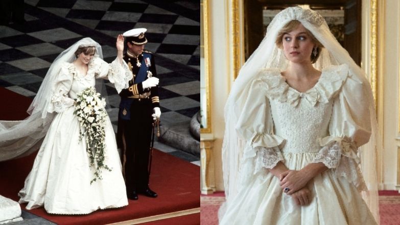 Za projekt efektownej kreacji ozdobionej mierzącym ponad 7,5 metra trenem odpowiedzialni byli David i Elizabeth Emanuel. Suknią serialowej księżnej zajęła się natomiast zdobywczyni nagrody Emmy, kostiumografka Amy Roberts. Roberts zależało na tym, by nie tworzyć wiernej repliki ślubnej kreacji Lady Di, a jedynie "oddać jej ducha". Stworzyła więc nowy projekt niemalże bliźniaczo podobny do oryginału - m.in. za sprawą charakterystycznego kształtu sylwetki oraz bufiastych rękawów.