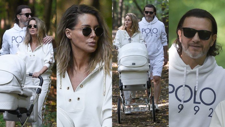 Niestrudzeni Małgorzata Rozenek i Radosław Majdan pchają luksusowy wózek Henia po leśnej ściółce (ZDJĘCIA)