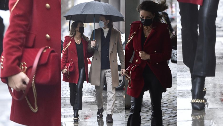 Gosia deszczowy dzień postanowiła umilić sobie dodatkiem w postaci torebki Gucci za siedem tysięcy złotych. Całość podkreśliła żakietem ozdobionym złotym łańcuchem oraz licznymi łańcuszkami.
