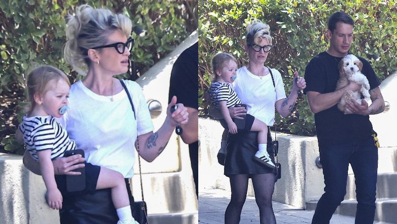 Teraz Kelly Osbourne była widziana przez fotoreporterów podczas spaceru. Niosła na ręku swojego syna. W przechadzce towarzyszył jej także kierowca Sharon, który przytulał do piersi pieska. 40-latka podkreśliła swoją odchudzoną sylwetkę, wkładając krótką czarną spódniczkę i białą koszulkę. Stylizację uzupełniła mokasynami i długimi skarpetkami. Córka Ozzy'ego postanowiła ubrać swoją pociechę w tych samych kolorach. Mały Sydney miał na sobie krótkie spodenki i bluzkę w paski.