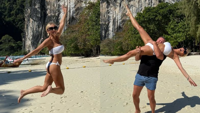 Odziana w białe bikini Monika Chwajoł kręci piruety w silnych ramionach męża. Jacek został porównany do bohatera "Słonecznego patrolu"