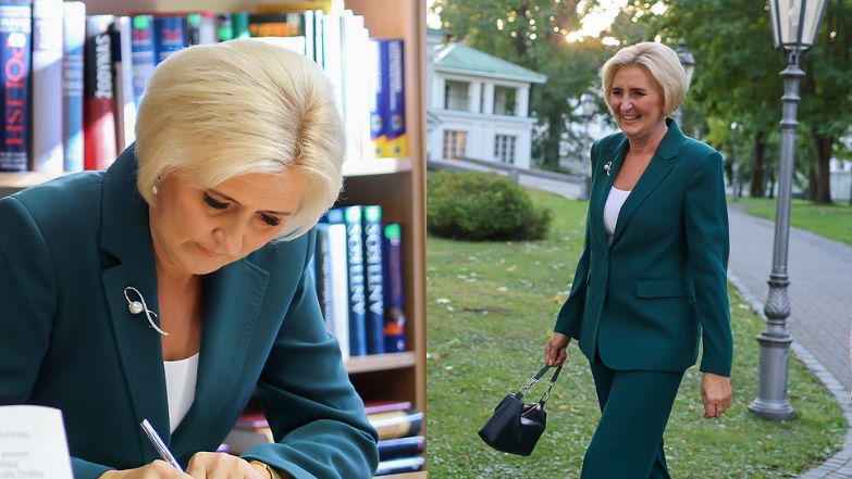 Tego dnia Agata Duda miała na sobie biały top oraz klasyczny garnitur w kolorze butelkowej zieleni. Szykowny "look" uzupełniła idealnie dopasowanymi szpilkami oraz filigranową, czarną torebką.