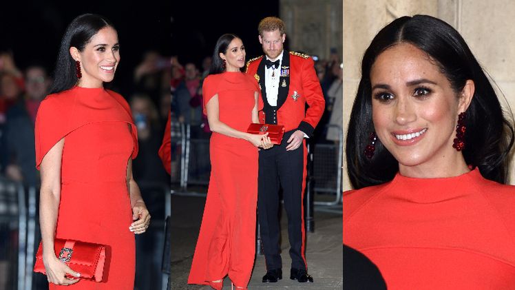 Tego dnia Meghan zachwyciła w czerwonej kreacji Safiyaa, do której dodała satynową kopertówkę i czółenka.