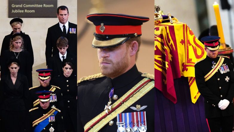 OŚMIORO WNUCZĄT, w tym 14-letni James i książę Harry w mundurze, czuwa przy trumnie królowej Elżbiety II w Westminster Hall (ZDJĘCIA)