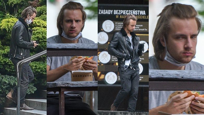 Osobliwie uczesany Maciej Musiał zajada burgera, po czym pędzi na mszę do pobliskiego kościoła. Dobrze się prezentuje? (ZDJĘCIA)