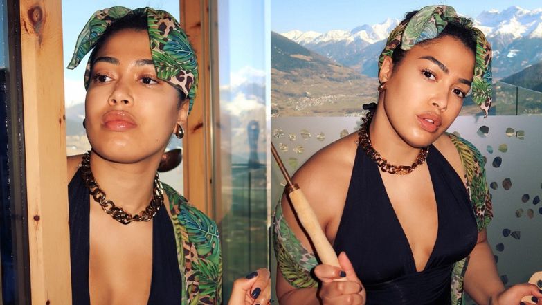 Patricia Kazadi w kostiumie kąpielowym eksponuje swoje wdzięki, dzierżąc w dłoni chochlę do zupy i garnek