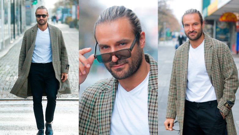 Nonszalanckim krokiem Stramowski maszerował powoli w stronę obiektywów, dokładnie eksponując swoją ostrożnie skompletowaną stylizację: pięknie skrojony biały t-shirt z dekoltem w delikatny serek, niezobowiązujące chinosy. Do tego dobrał uniwersalne skórzane buty i płaszcz w pepitkę w odcieniach ziemi, który zrobił prawdziwą furorę. Zwieńczeniem modowej kompozycji stały się okulary przeciwsłoneczne, zza których aktor rzucał zalotne spojrzenia.