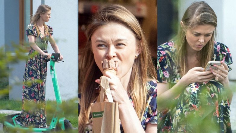Posępna Joanna Opozda pędzi na hulajnodze do marketu i pałaszuje loda (ZDJĘCIA)