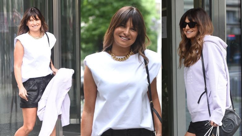 Do telewizji Lewandowska przyszła w prostym białym topie i skórzanych szortach. Całość uzupełniła czarnymi botkami na koturnie, na szyi zawiesiła natomiast złoty łańcuch. Przygotowana na nagłe załamanie pogody trenerka zabrała również ze sobą ciepłą bluzę.