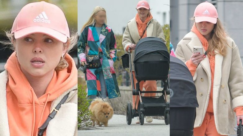 Przyodziana w brzoskwiniowy dres Joanna Opozda spaceruje z mamą, Vincentem i suczką Marilyn (ZDJĘCIA)