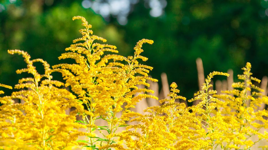 Inflorescences of a yellow field flower of a goldenrod close up
