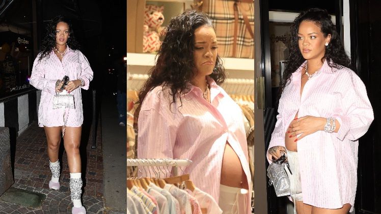 Termin porodu zbliża się wielkimi krokami, Rihanna kompletuje więc wyprawkę dla bobasa. W piątek artystka została przyłapana na buszowaniu po sklepie Couture kids w West Hollywood w poszukiwaniu ciuszków dla pociechy. Celebrytka miała na sobie luźną, różową koszulę od piżamy (naturalnie zapiętą tylko na jeden guzik), do której dobrała białe szorty, błyszczące skarpety i futrzaste sandałki na obcasie Saint Laurent za 5 600 złotych. W dłoni wokalistka dzierżyła z dumą srebrną torebkę Balenciagi za ok. 8 tysięcy złotych. Czatującym przed butikiem fotografom udało się uwiecznić moment, jak Riri zachwyca się malutkim płaszczykiem prezentowanym przez ekspedientkę.