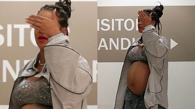 Rihanna zasłania się przed fotoreporterami na lotnisku w Los Angeles, eksponując olbrzymi, ciążowy brzuch (ZDJĘCIA)