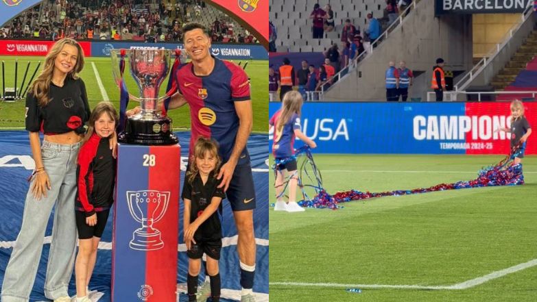Lewandowski celebrował zdobycie przez swój klub potrójnej korony - mistrzostwa Hiszpanii, Pucharu Króla oraz Superpucharu Hiszpanii - w towarzystwie ukochanej i córek. Na profilu Anny pojawiło się nagranie z Klarą i Laurą, dokazującymi na murawie po zakończonym meczu. Nie zabrakło też rodzinnej fotki z pucharami. Dziewczynki pozowały w ciemnych strojach sportowych, a słynna trenerka miała na sobie szerokie jeansy i czarno-czerwoną klubową koszulkę Barcy, którą związała, aby odsłonić płaski, wyrzeźbiony brzuch.