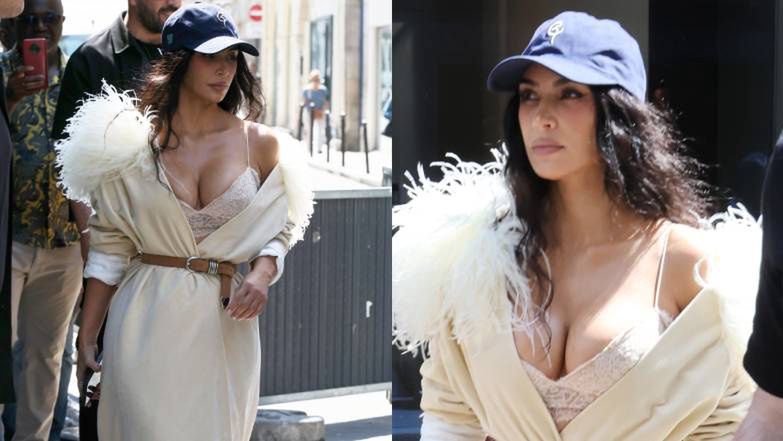 Kim wciąż przebywa w Paryżu, w którym to na każdym kroku towarzyszą jej paparazzi. Tym razem sfotografowali ją, gdy opuszczała jeden z hoteli. Celebryta zaprezentowała się w beżowym okryciu przypominającym szlafrok, który został ozdobiony białymi piórkami. Całość zestawiła z czapką z daszkiem i koronkowym stanikiem.