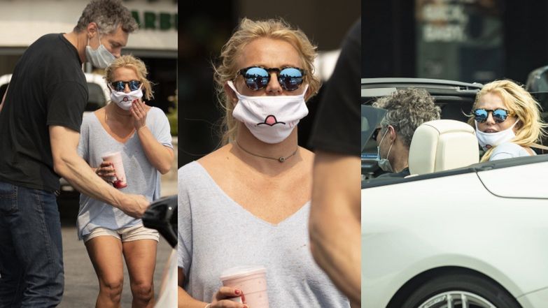 Rozczochrana Britney Spears wyskakuje z merca po truskawkowego shake'a w maseczce nałożonej do góry nogami (ZDJĘCIA)