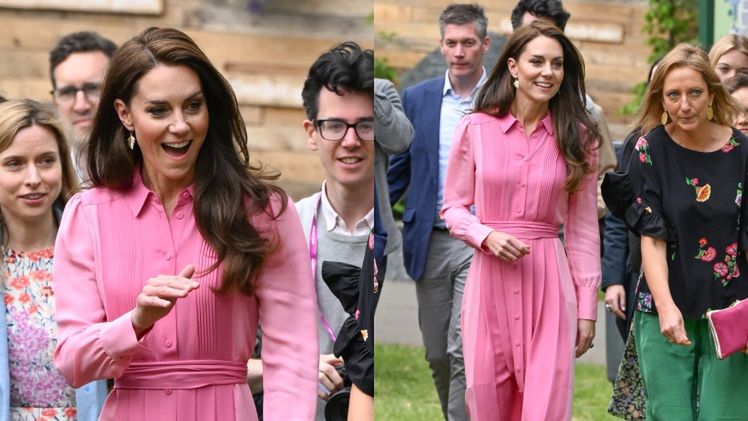 Słynąca z dobrej prezencji Kate po raz kolejny udowodniła, że ma wyczucie stylu. 41-latka miała na sobie jedwabną koszulową sukienkę marki ME+EM. Tę samą kreację w kolorze gumy balonowej wcześniej nosiła również jej matka Carole. To nie pierwszy raz, kiedy Middleton zdecydowała się na sukienkę od ME+EM. W 2021 roku włożyła ją na spotkanie z chorującą na białaczkę dziewczynką.