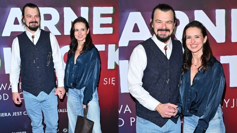 Wcielający się w jedną z głównych ról Ogrodnik cierpliwie pozował z żoną do zdjęć. Oboje postawili na proste stylizacje, dopasowując się do siebie wyborem jeansów. Mężczyzna włożył klasyczną białą koszulę oraz granatową kamizelkę. Z kolei jego wybranka uzupełniła spodnie z rozszerzanymi nogawkami połyskującą koszulą.